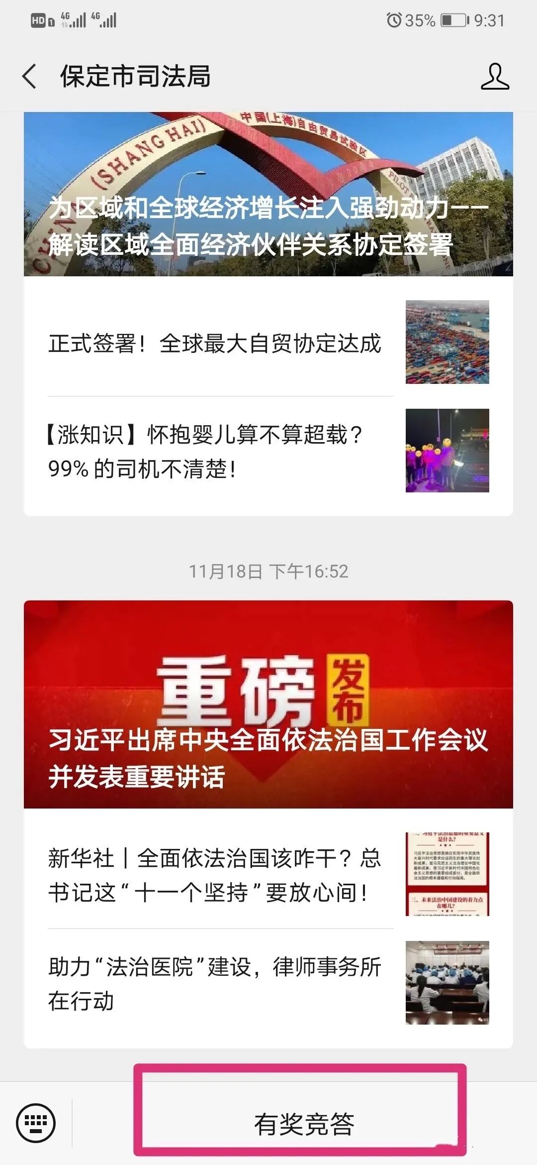 关注“保定市司法局”微信公众号后,进入微信公众号,点击底部菜单“有奖竞答”。